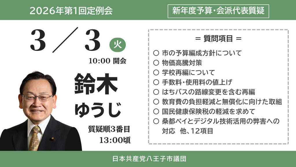 2026年2月24日 / 最終更新日時 : 2026年2月25日 hachioji_admin 議会での活動 2026年第1回定例会本会議|2026年度予算等に対する会派代表質疑|2026年3月3日 鈴木ゆうじ 【本会議2日目】2026年度予算等に対する会派代表質疑 3月3日(火)10:00開会 質問者:鈴木ゆうじ(13:00頃登壇予定) 《質問項目》 1,市の予算編成方針について 1)財政の見通し ア、予算の連続最高額更新の事 […]