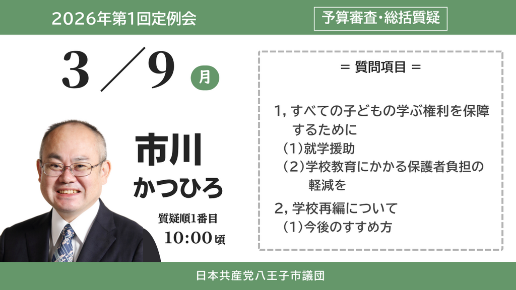 2026年3月1日 / 最終更新日時 : 2026年3月2日 hachioji_admin 市川かつひろ 2026年第1回定例会_予算等審査特別委員会|総括質疑|2026年3月9日 市川かつひろ 【予算等審査特別委員会】総括質疑3日目 3月9日(月)10:00開会 質問者:市川かつひろ 発言順:1番目(10:00開始) 《質問項目》 1,すべての子どもの学ぶ権利を保障するために (1)就学援助 (2)学校教育にか […]