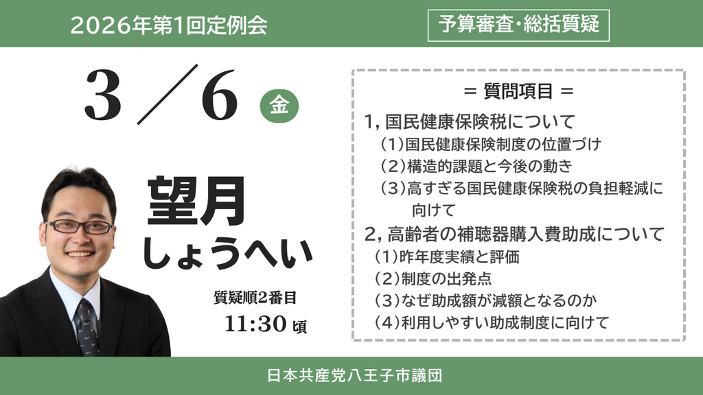 2026年3月1日 / 最終更新日時 : 2026年3月2日 hachioji_admin 望月しょうへい 2026年第1回定例会_予算等審査特別委員会|総括質疑|2026年3月6日 望月しょうへい 【予算等審査特別委員会】総括質疑2日目 3月6日(金)10:00開会 質問者:望月しょうへい 発言順:2番目(11:30頃登壇予定) 《質問項目》 1,国民健康保険税について (1)国民健康保険制度の位置づけ (2)構造 […]