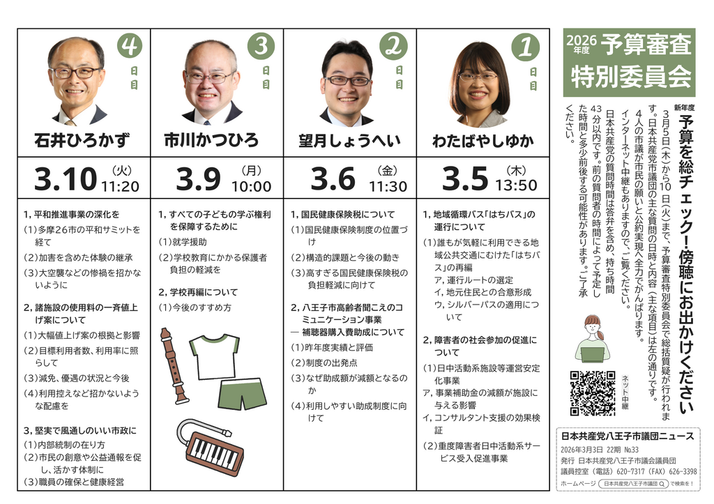 2026年3月1日 / 最終更新日時 : 2026年3月2日 hachioji_admin 石井ひろかず 2026年第1回定例会_予算等審査特別委員会|総括質疑|2026年3月10日 石井ひろかず 【予算等審査特別委員会】総括質疑4日目 3月10日(火)10:00開会 質問者:石井ひろかず 発言順:3番目(11:20頃登壇予定) 《質問項目》 1,平和推進事業の深化を (1)多摩26市の平和サミットを経て (2)加 […]
