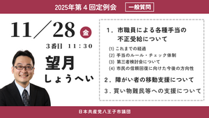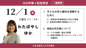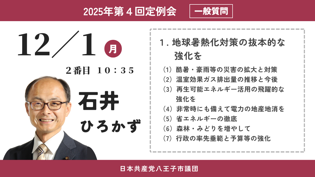 2025年11月27日 / 最終更新日時 : 2025年11月27日 hachioji_admin 石井ひろかず 2025年第4回定例会本会議|一般質問|2025年12月1日 石井ひろかず 【本会議2日目】一般質問 12月1日(月)2番目 10時35分頃 登壇予定 質問者:石井ひろかず 【一括質問+一問一答方式】 1.地球暑熱化対策の抜本的な強化を (1)酷暑・豪雨等の災害の拡大と対策 (2)温室効果ガス排出量の推移と今後 (3)再生可能エネルギー活用の飛躍的な強化を ア.太陽光・太陽熱 イ.水力・風力 ウ.バイオマス等 (4)非常時にも備えて電力の地産地消を (5)省エネルギーの徹底 (6)森林・みどりを増やして (7)行政の率先垂範と予算等の強化