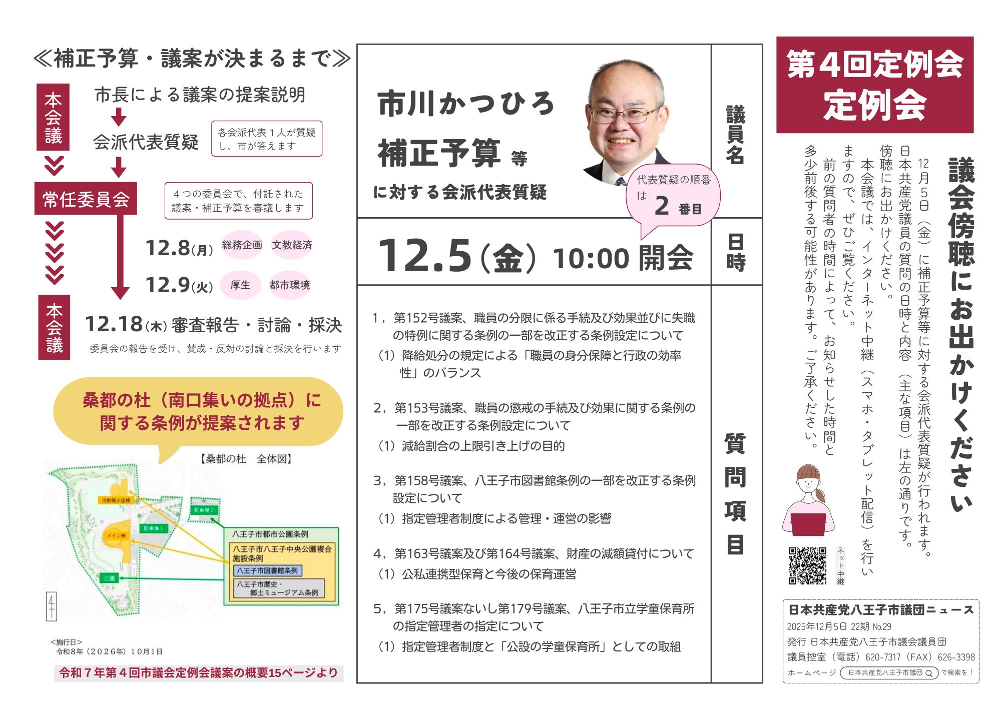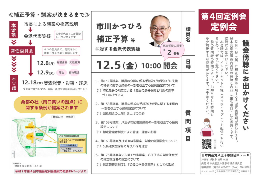 2025年12月4日 / 最終更新日時 : 2025年12月4日 hachioji_admin 市議団ニュース 八王子市議団ニュース22期 No.29 12月5日(金)に補正予算等に対する会派代表質疑が行われます。 市川かつひろ議員が質疑を行います。 前の質問者の時間によって、お知らせした時間と多少前後する可能性があります。ご了承ください。 インターネット中継もありますので、ご覧ください。 ※録画中継も見ることができます。