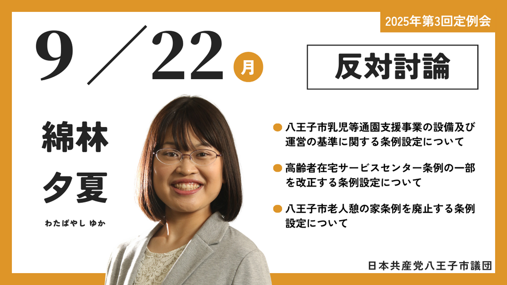 2025年9月22日 / 最終更新日時 : 2025年9月22日 hachioji_admin わたばやしゆか 2025年第3回定例会本会議|付託3議案に対する反対討論|2025年9月22日 わたばやしゆか それでは、第120号議案、第125号議案、および、第126号議案の3件について、日本共産党八王子市議会議員団を代表し反対討論を行います。 はじめに、第120号議案、八王子市乳児等通園支援事業の設備及び運営の基準に関する条 […]